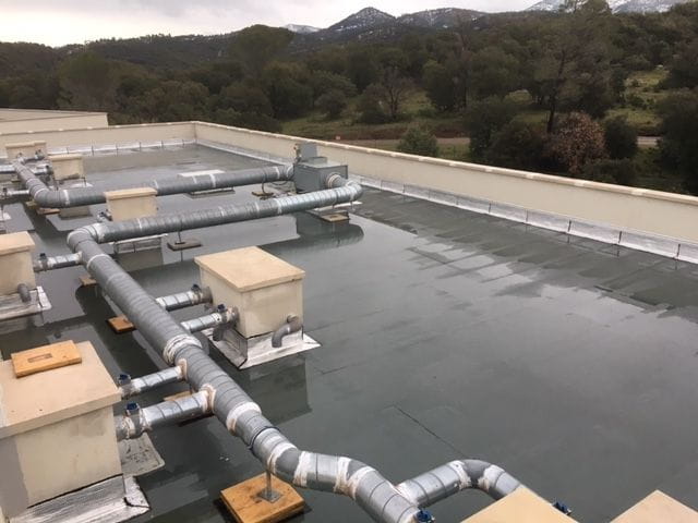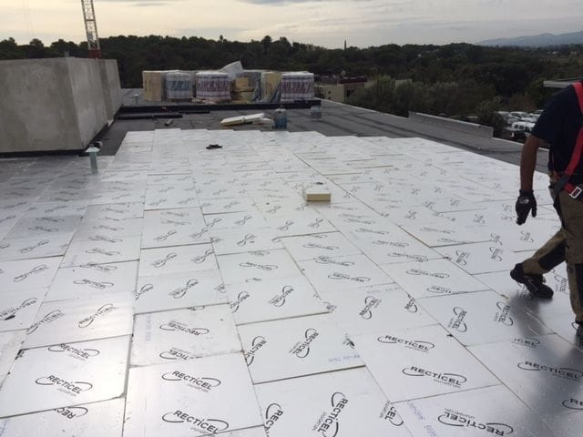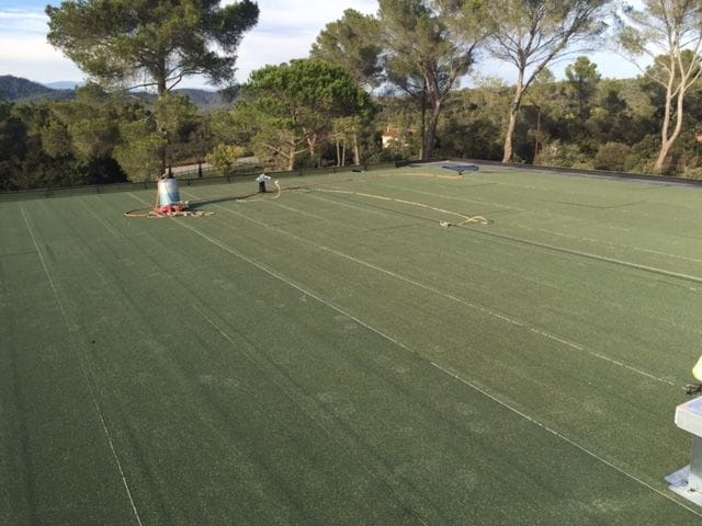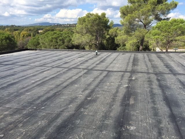 Sur le site de NATURA PARC à Fréjus, une intervention complète d’étanchéité a été réalisée. Après la pose de l’Enduit d’Imprégnation à Froid (E.I.F.), les équipes ont installé le pare-vapeur puis l’isolant thermique pour optimiser la performance énergétique du bâtiment.