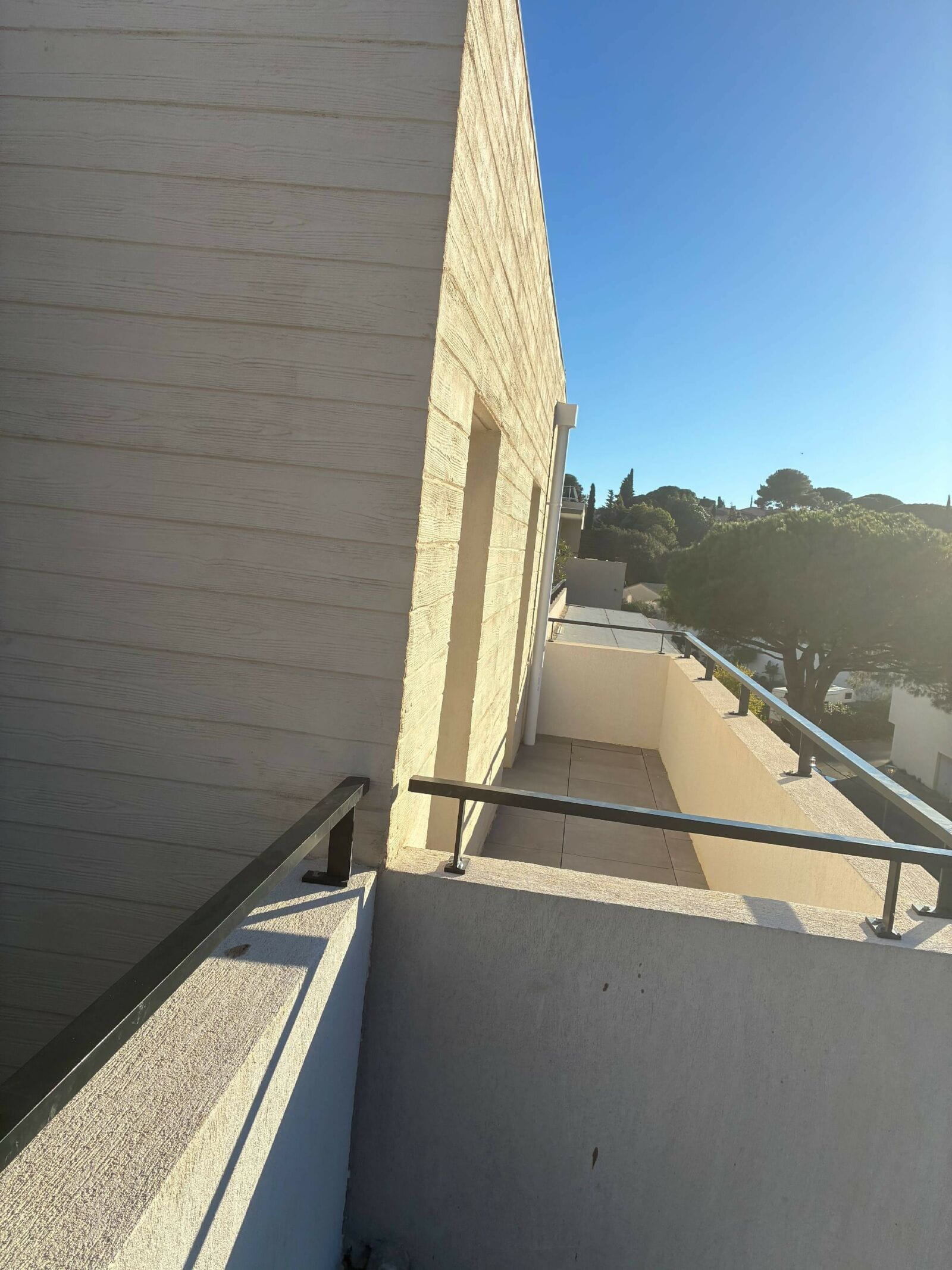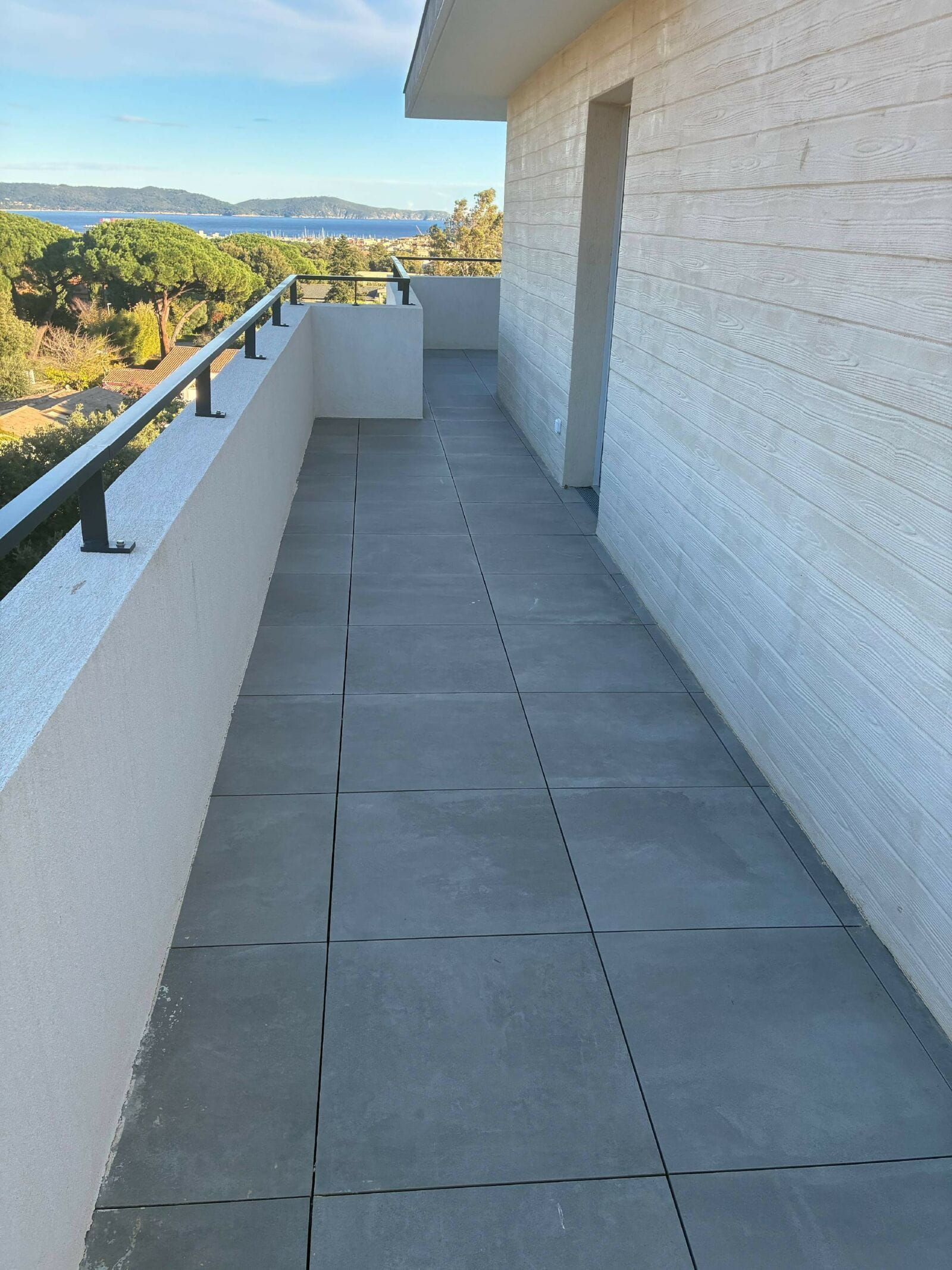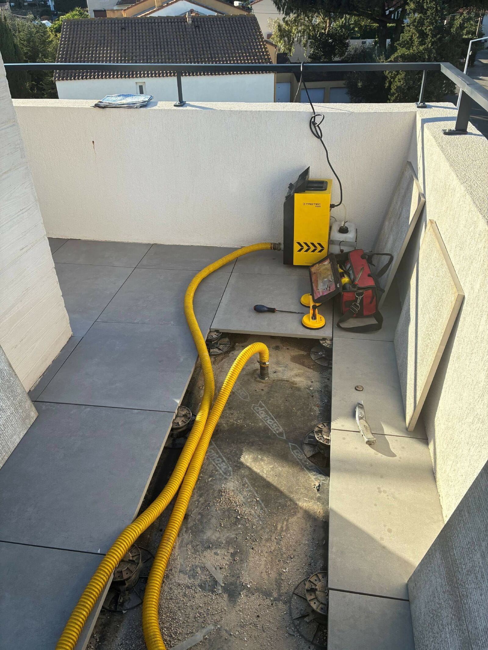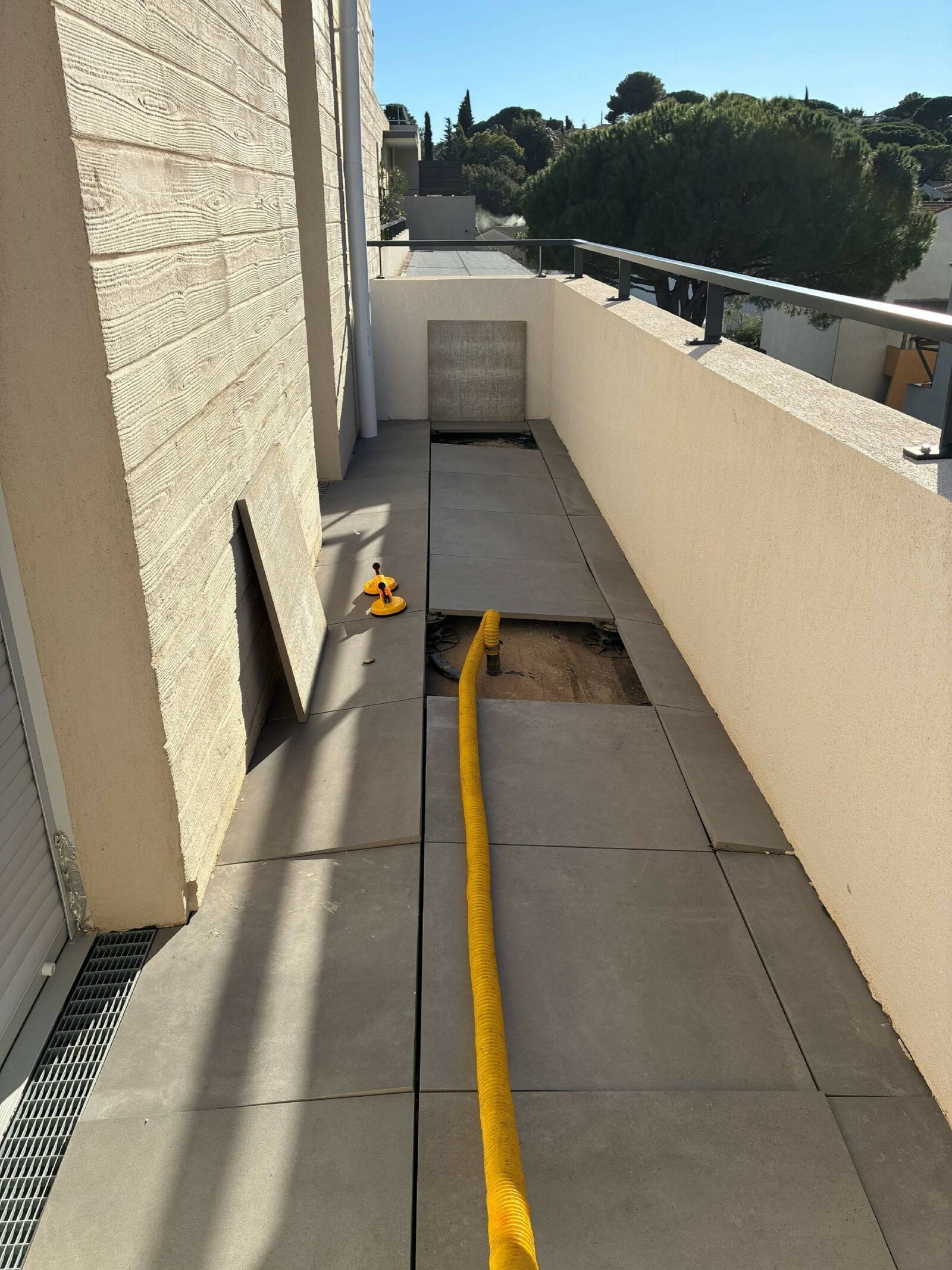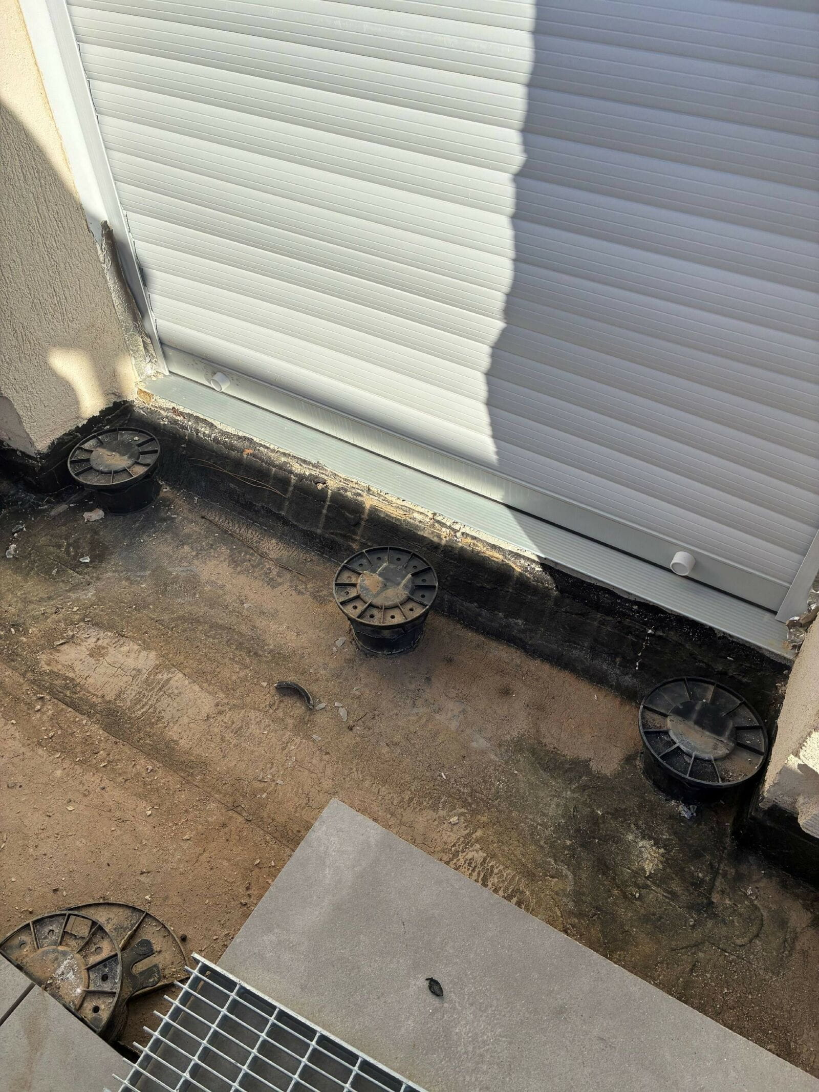 Les investigations ont mis en évidence une absence de calfeutrement entre le seuil aluminium de la porte-fenêtre et le rejingot béton, provoquant des écoulements d’eau lors des épisodes pluvieux et venteux. L’absence de casquette de protection sur la terrasse favorise l’infiltration directe de l’eau sous la menuiserie, puis dans la chape de pose.