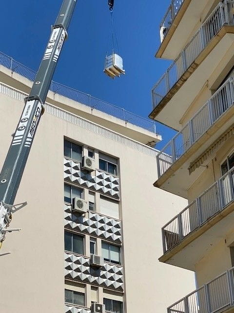 Le chantier a été sécurisé par la mise en place de filets et de garde-corps. Les matériaux ont été approvisionnés par grutage.