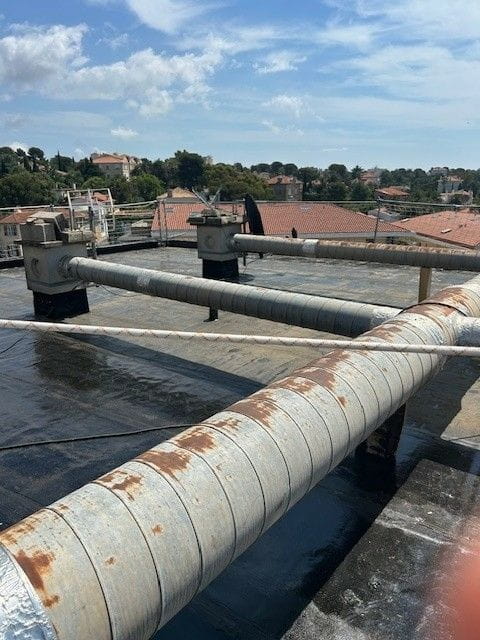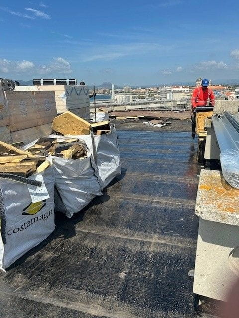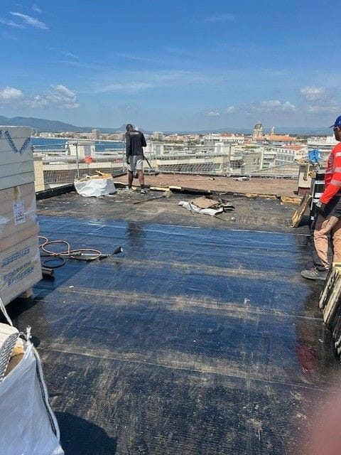Réalisation complète de la réfection de la toiture-terrasse de la Résidence Orion à Saint-Raphaël. Les travaux ont débuté par l’arrachage des anciens revêtements d’étanchéité et de l’isolant existant, suivis de la mise en œuvre d’une nouvelle isolation Knauf Thane ET 100 mm et d’une étanchéité bicouche élastomère Elastophene Flam 25.