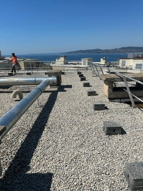 La toiture-terrasse a été finalisée sous protection lourde gravillon, assurant durabilité, performance thermique et étanchéité optimale.